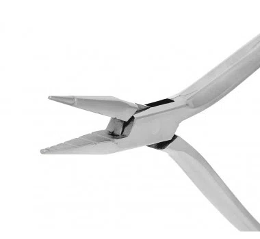 O alicate possui bico plano na parte interior com ranhuras que permite maior firmeza ao segurar o fio.Indicado para manuseio com fio ortodôntico.