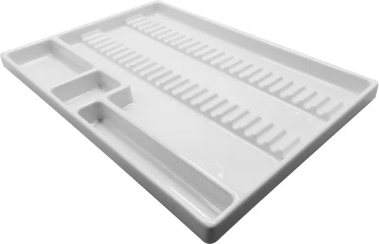 Indicado para armazenar e organizar instrumentos odontologicos.Divisões: 5 divisões.Dimensões: 35 X 25 X 2,5 cm.Peso:180 gramas.