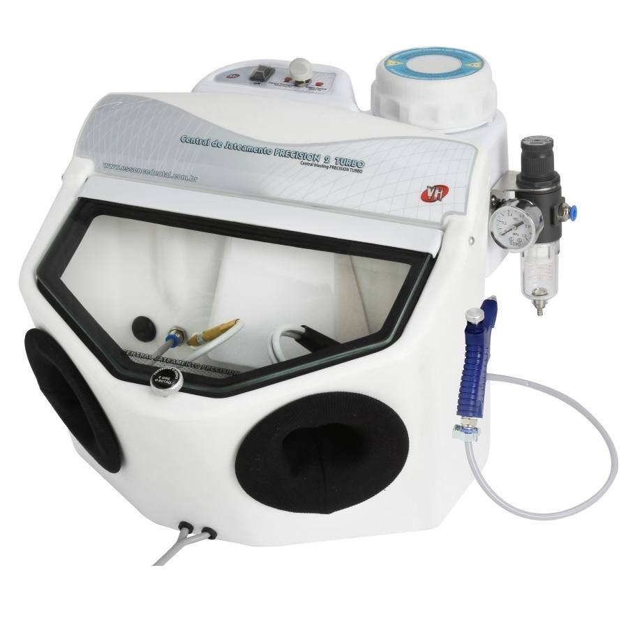 IndicaçãoIndicado para limpeza e jateamento de peças fundidas para melhorar e facilitar a aderência.Características* Carenagem confeccionada em polietileno de alto impacto media densidade, não amarela, não resseca e não oxida, diferente do que ocorre com os gabinetes confeccionados em chapas de aço;* Design revolucionário com entrada frontal para as mãos em ângulo e painel amplo com angulagem de 45° facilitando a visualização da peça, proporcionando ao operador exercer postura correta, evitando assim a fadiga muscular;* Aro de fixação das luvas, com facilidade de substituição das mesmas;* Visor resinado para evitar ofuscamento;* Possui ótima vedação do painel;* Possui um reservatório pressurizado com capacidade para até 1,100 kg;* Possui uma válvula seletora dos bicos jateadores (caneta pressurizada ou caneta mistura);* Chave liga/desliga com proteção para evitar que as partículas danifiquem a mesma;* Possui filtro condensador de ar, evitando que ocorra umidade no elemento abrasivo;* Possui válvula para regulagem de pressão;* Canetas desenvolvidas, com design moderno e ergonômico, para otimizar o trabalho do profissional. Os refis são confeccionados em aço (metal duro) garantindo maior durabilidade;* Bivolt automático;* Possui sistema de iluminação a led;* Possui exaustor para partículas emergentes que durante o trabalho atrapalham a visualização das peças, eliminando a necessidade do uso de máscaras de proteção das vias respiratórias do operador;* Peso líquido: 6 kg;* Peso bruto: 7.5 kg;* Capacidade da câmara de trabalho: 11l;* Pressão de trabalho: 80 a 100 libras | psi (0,55 a 0, 69 mpa) – (5.5 a 6.9 bar);* Voltagem: 110v / 220v bivolt automático;* Ventoinha elétrica: 12v /0.5a;* Led: 12v / 0.5a;* Frequência: 50/60 hz;* Dimensões: 410mm (comprimento) x 520mm (largura) x 420mm (altura);* Garantia: 1 ano..Itens inclusosUnidade. Bivolt.