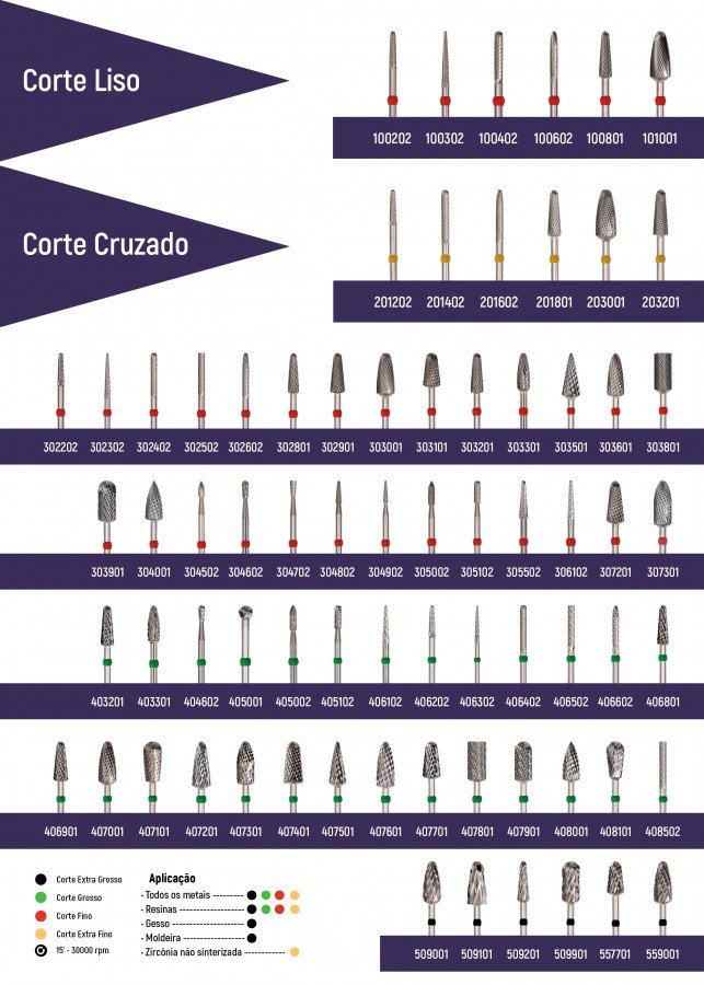 Indicado para todos os metais e resina acrílica.* Diferentes cortes, separados por tarjas coloridas.* Rigoroso processo de fabricação, com garantia de durabilidade.* Halice de proteção motora inclusa, impede que a poeira entre no motor.# corte extra grosso = preto# corte grosso = verde# corte fino = vermelho# corte extra fino = amarelo* 15 - 30000 rpm