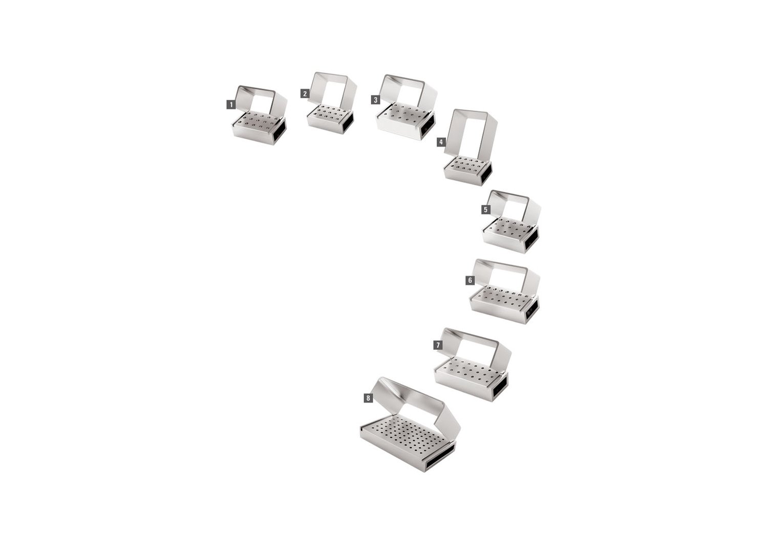 Indicação:* Caixa metálica que auxilia na organização, armazenamento, transporte e esterilização de brocas odontológicas.Caracteristicas:* Tampa com sistema de abertura e fechamento;* Material autoclavável (121°c);* Disponível nas versões:1.Ref: 0104001001 – 15 pontas ca2.Ref: 0104001009 – 15 pontas ca cirúrigica longa3.Ref: 0104001002 – 15 pontas fg4.Ref: 0104001004 – 15 pontas pm5.Ref: 0104001003 – 15 pontas fg & ca6.Ref:0104001006 – 21 pontas fg & ca7.Ref: 0104001005 – 21 pontas fg8.Ref: 0104001007 – 60 pontas fg* Reg. Anvisa: 80322400065.Itens inclusos:* Embalagem com 1 unidade.