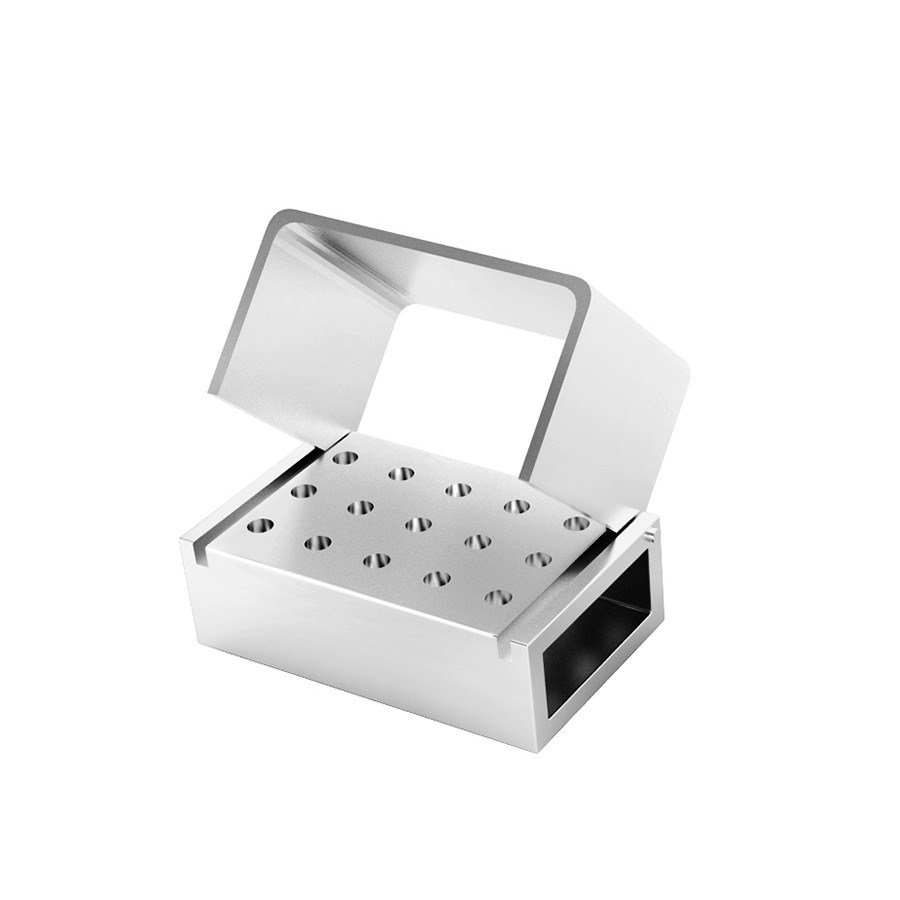 Caixa metálica que auxilia na organização, armazenamento, transporte e esterilização de brocas odontológicas.