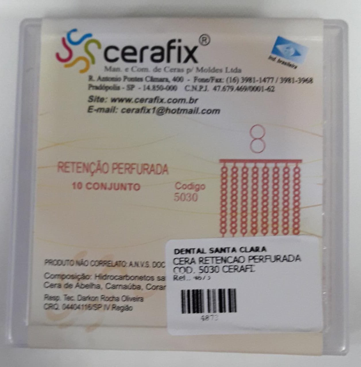 Cera retenção perfurada com 10 conjuntos;Composição: Hidrocarbonetos saturados, cera de abelha, carnaúba e corante;Cera para moldes.