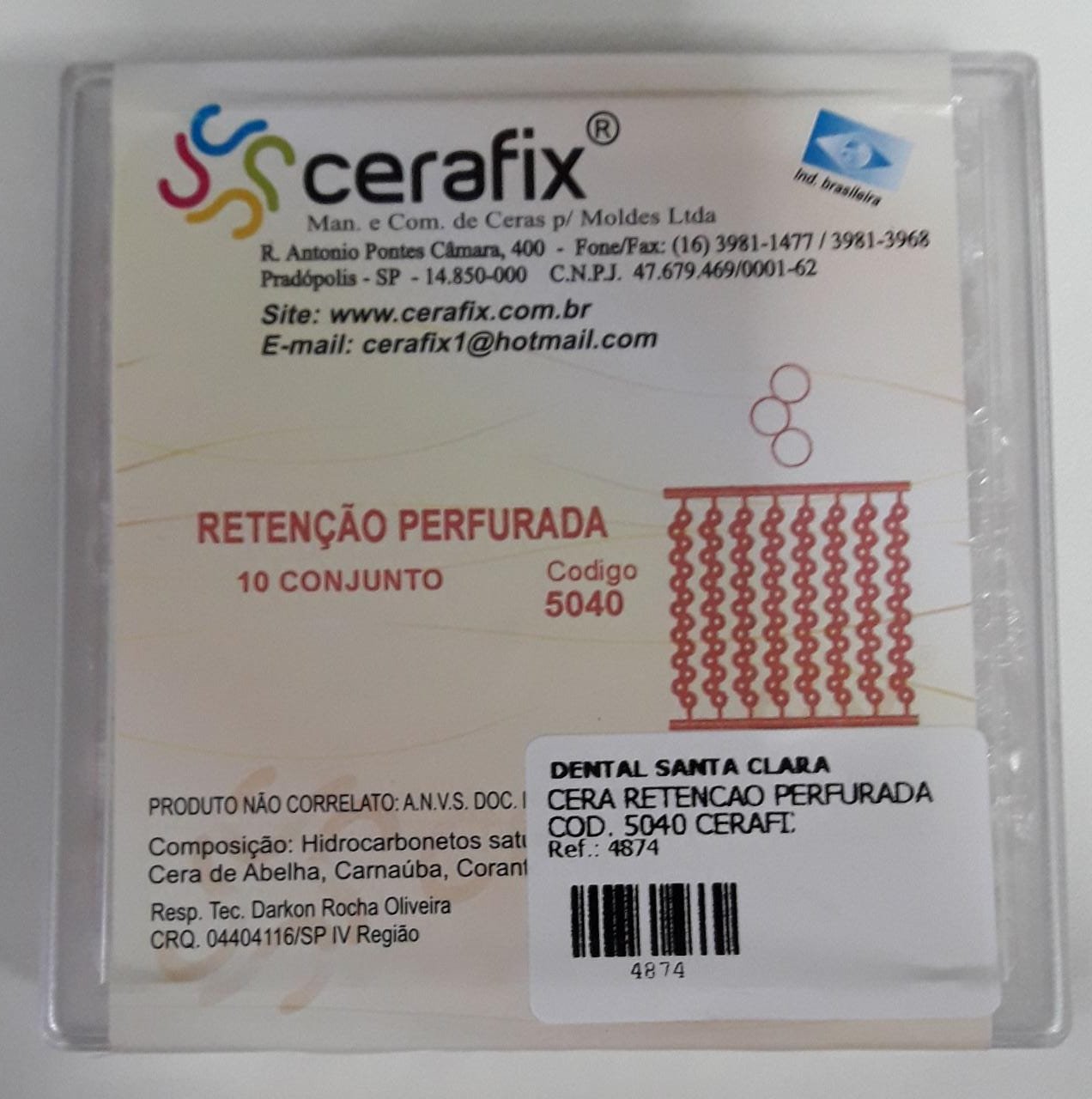 Cera retenção perfurada com 10 conjuntos;Composição: Hidrocarbonetos saturados, cera de abelha, carnaúba e corante;Cera para moldes.