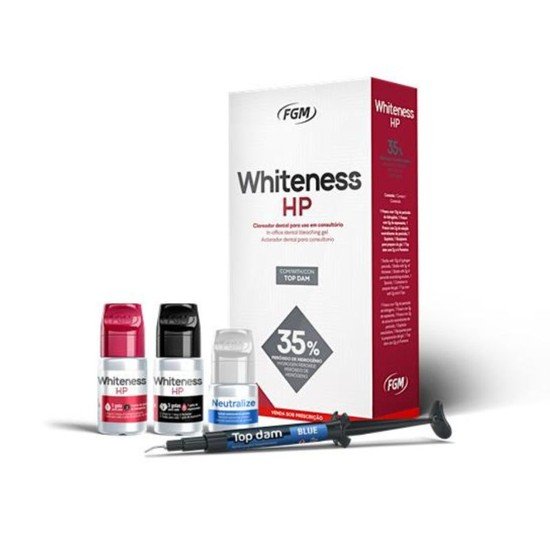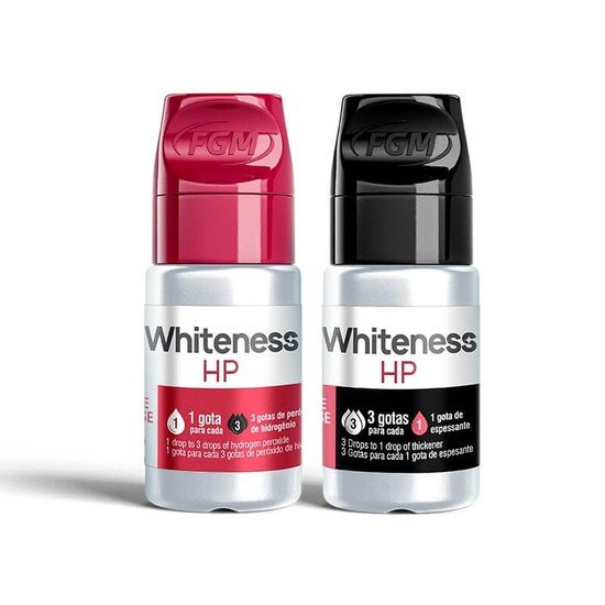 Esse Clareador Whiteness HP da FGM é um kit desenvolvido com peróxido de hidrogênio a 35%, para aplicação no consultório odontológico. Seu sistema de frascos proporciona manipulação precisa e excelente rendimento.