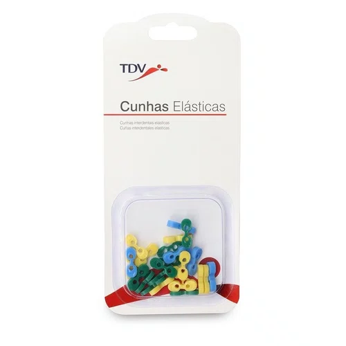 IndicaçãoAs cunhas elásticas tdv são indicadas para uso geral em procedimentos restauradores, sendo compatíveis com todos os sistemas de matrizes.Características* Fabricada em borracha e corantes atoxicas.* Uso único.* Possuem a função mecânica de adaptar matrizes e/ou afastar dentes adjacentes, agindo simultaneamente pelas faces vestibular e lingual.* Quando existir comprovada alergia a qualquer um dos seus componentes, o produto não deve ser utilizado.* Recomenda-se que a utilização das cunhas seja sempre acompanhada de isolamento absoluto do campo operatório, uma vez que objetos soltos podem ser deglutidos ou aspirados acidentalmente.Itens inclusosEmbaladas em blister com 25 unidades.