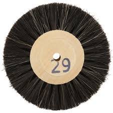 Escova circular de crina para desbastar, polir e lustrar peças em resina acrílica em prótese total, parcial ou provisórios.Centro de madeira com carreiras de crina. Uso indicado em politriz..