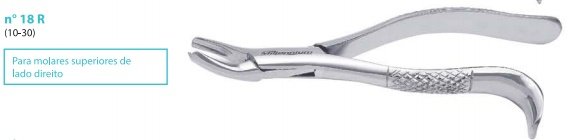 • Nº 1: Indicado para incisivos e caninos superiores;• N° 2: Indicado para extração de pré-molares e molares superiores de ambos os lados;• Nº 3: Indicado para extração de pré-molares e raízes inferiores de ambos os lados;• N° 4: Indicado para extração de raízes superiores de ambos os lados;• N° 5: Indicado para extração de incisivos inferiores de ambos;• N° 6: Indicado para extração de molares inferiores de ambos os lados;• N° 16: Indicado para molares inferiores de ambos os lados;• Nº 18l: Indicado para extração de molares superiores do lado esquerdo;• N° 18d: Indicado para molares superiores de ambos os lados;• N° 18r: Indicado para molares inferiores de ambos os lados;• N° 21: Indicado para extração de pré-molares inferiores;• N° 27: Indicado para molares superiores de ambos os lados;• N° 44: Indicado para incisivos inferiores;• N° 65: Indicado para raízes inferiores de ambos os lados;• Nº 69: Indicado para extração de fragmentos e raizes pequenas superiores e inferiores;• N° 150: Indicado para dentes e raízes superiores;• N° 151: Indicado para dentes e raízes inferiores.-• Aço inox;• Autoclavável.