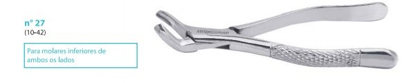 • Nº 1: Indicado para incisivos e caninos superiores;• N° 2: Indicado para extração de pré-molares e molares superiores de ambos os lados;• Nº 3: Indicado para extração de pré-molares e raízes inferiores de ambos os lados;• N° 4: Indicado para extração de raízes superiores de ambos os lados;• N° 5: Indicado para extração de incisivos inferiores de ambos;• N° 6: Indicado para extração de molares inferiores de ambos os lados;• N° 16: Indicado para molares inferiores de ambos os lados;• Nº 18l: Indicado para extração de molares superiores do lado esquerdo;• N° 18d: Indicado para molares superiores de ambos os lados;• N° 18r: Indicado para molares inferiores de ambos os lados;• N° 21: Indicado para extração de pré-molares inferiores;• N° 27: Indicado para molares superiores de ambos os lados;• N° 44: Indicado para incisivos inferiores;• N° 65: Indicado para raízes inferiores de ambos os lados;• Nº 69: Indicado para extração de fragmentos e raizes pequenas superiores e inferiores;• N° 150: Indicado para dentes e raízes superiores;• N° 151: Indicado para dentes e raízes inferiores.-• Aço inox;• Autoclavável.