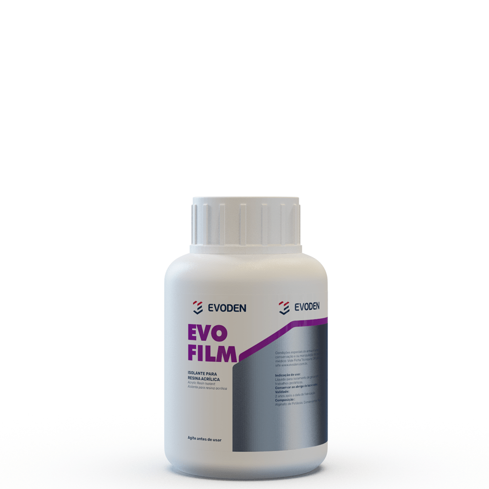 Desenvolvido com alta tecnologia e formulação inteligente à base de alginato, Evofilm proporciona isolamento e proteção entre materiais acrílicos e a superfície de gesso utilizados para a confecção de restaurações protéticas. Entre os principais benefícios estão o tempo de secagem rápida e superfícies lisas e homogêneas que resultam em um isolamento efetivo. Como resultado, obtém-se a otimização e agilização dos processos de trabalho no geral.