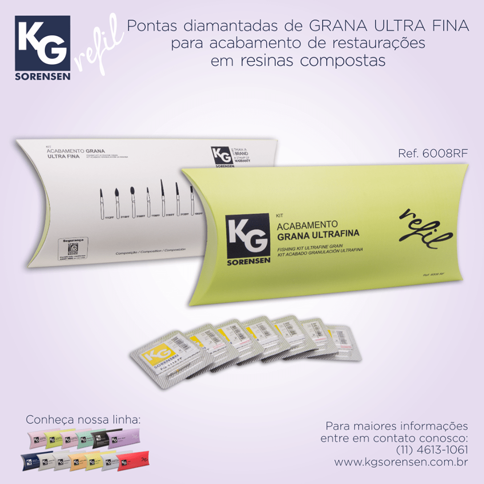 Kit acabamento grana ultrafina ref. 6008rf - esta coleção é composta de 7 pontas diamantadas de granulometria ultrafina (30 micrômetros), identificadas por um anel de cor amarelo em suas hastes, e destinam-se ao acabamento das superfícies e margens de restaurações estéticas confeccionadas com resinas compostas fotoativadas. As pontas diamantadas de granulação ultrafina estão indicadas para a confecção de bisel cavo-superficial, anatomização de restaurações, além do acabamento de superfícies e margens das restaurações estéticas realizadas com resinas compostas fotoativadas.