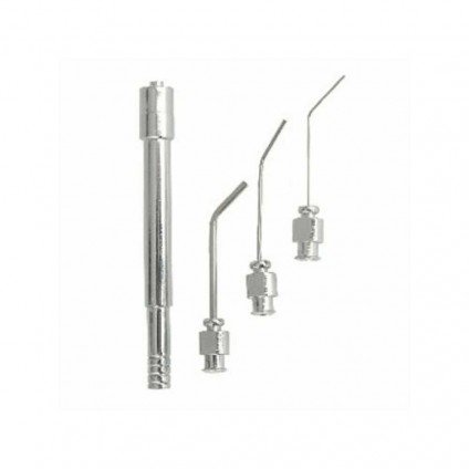 Kit com cânula e pontas para aspiração no tratamento endodôntico.Embalagem com 1 cânula + 1 agulha 40x20 mm + 1 agulha 40x10 mm + 1 agulha 40x6 mm.