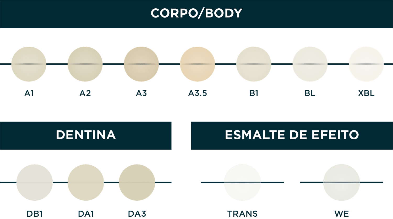 Inclui tons opacos, translúcidos e efeitos especiais para restaurações personalizadas e naturais;