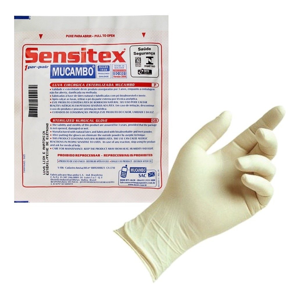 O que você precisa saber sobre a luva cirúrgica sensitex mucambo?* Embalagem com 1 par;.* Luvas utilizadas por profissionais da área da saúde..O que é a luva cirúrgica mucambo?A luva sensitex é um produto da mucambo de uso único, confeccionado a base de látex de borracha natural e lubrificado com pó bioabsorvível.As luvas são esterilizadas pelo processo de raio gama cobalto 60..Para que é utilizada a luva cirúrgica?As luvas sensitex mucambo são utilizadas por profissionais da área da saúde para não ter contato direto com as mãos durante procedimentos e prevenir possíveis contaminações..Precauções ao utilizar a luva:Devido a luva mucambo ser confeccionada com látex de borracha natural seu uso pode causar reações alérgicas em pessoas sensíveis ao látex.Ao calçar as luvas, retire o excesso de pó da parte externa por técnica asséptica.Não utilize as luvas caso a embalagem esteja violada.Proteja este produto do calor, umidade, luz e descarte após o uso.