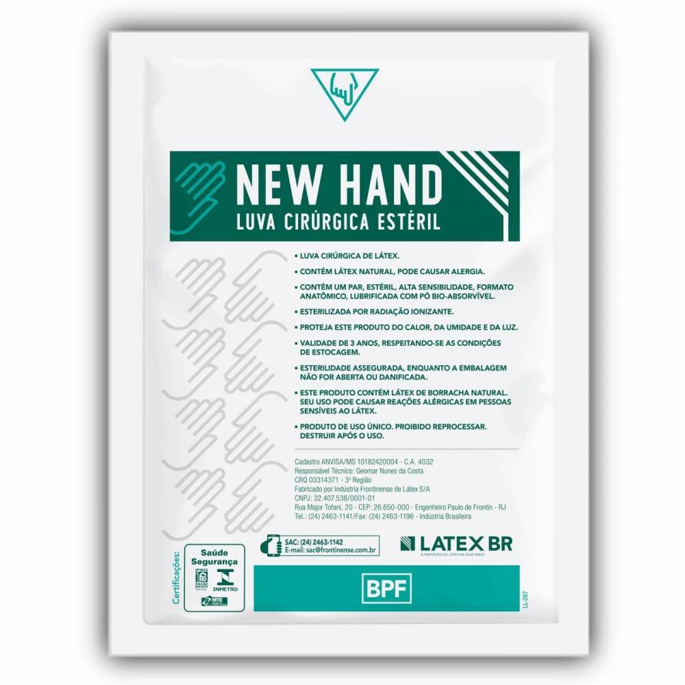 Luva anatômica lubrificada com pó bio-absorvível, esterilizada por radiação ionizante..As luvas cirúrgicas esterilizadas, látex br new hand têm como finalidade atuar como barreira de proteção biológica durante procedimentos invasivos e delicados proporcionando segurança, resistência e conforto aos pacientes e usuários.