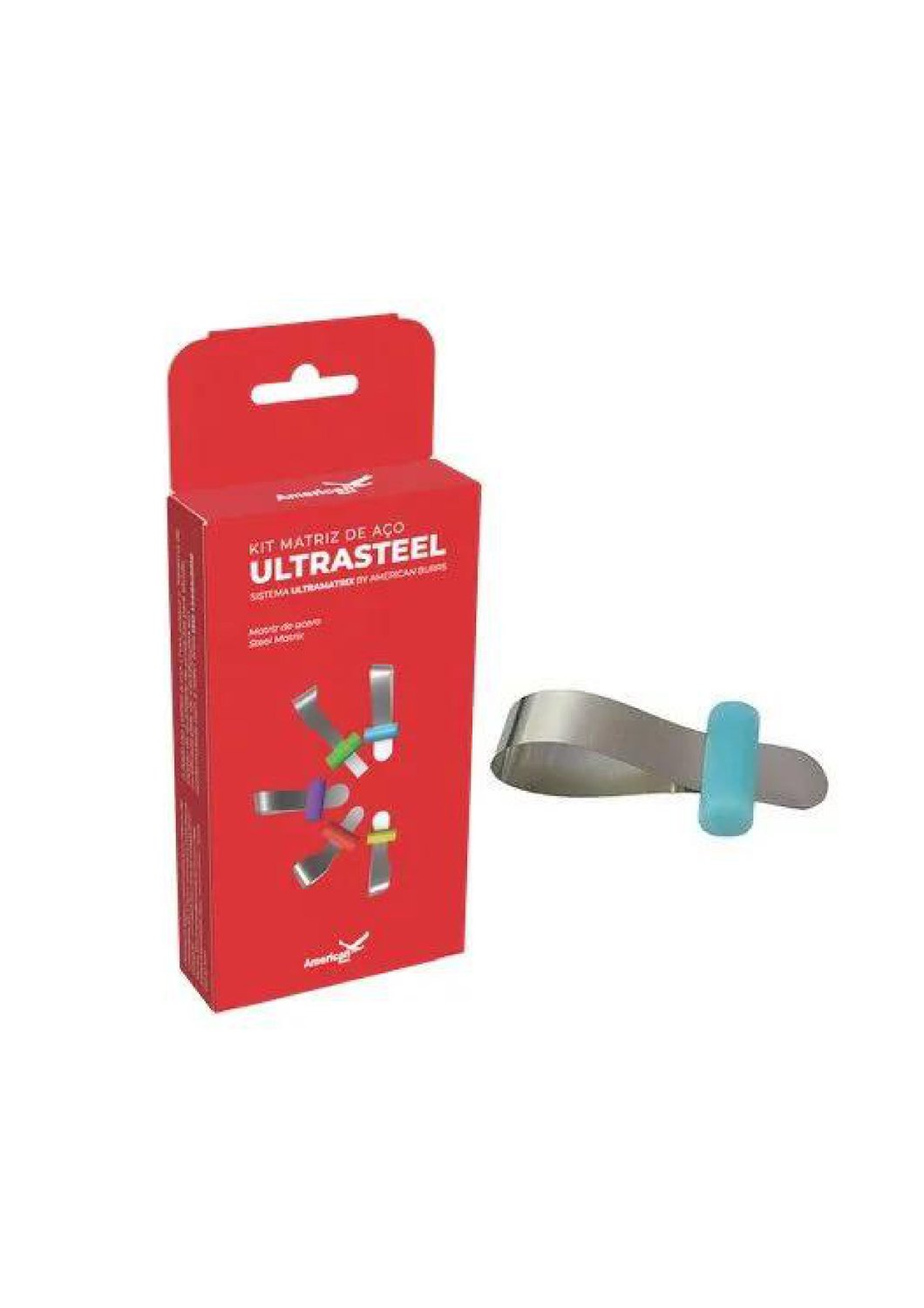 Conjunto de matrizes odontológicas metálicas Ultrasteel, indicado para restaurações em dentes posteriores, oferecendo excelente adaptação e contorno anatômico. Proporciona isolamento eficiente e controle preciso durante procedimentos restauradores, garantindo acabamento de alta qualidade. Cada unidade possui 64 mm de comprimento por 6,5 mm de largura. Contém 20 unidades. Produto desenvolvido pela American, referência em materiais odontológicos confiáveis.