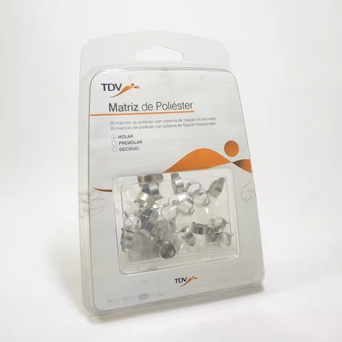 Matriz de poliéster com sistema de fixação incorporado para restaurações classe ii.Características e benefícios– indicadas para restaurações de classe ii com resinas compostas fotopolimerizáveis– pré-contornadas, com sistema de fixação incorporado que permite a regulagem da matriz ao tamanho do dente, fixando-a firmemente e dispensando o uso do porta-matriz– excelente adaptação que proporciona o restabelecimento de pontos de contato e cristas marginais otimizam a qualidade da restauração e reduzem o tempo operatório– maior conforto para o paciente– produzidas em poliéster com espessura 0,075mm– disponíveis para pré-molares e molares permanentes e molares decíduos