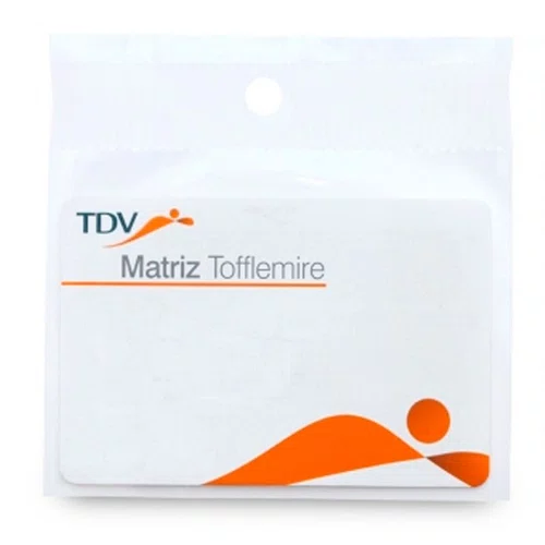 Fita de aço inoxidável em formatos tofflemire.Características e benefícios– ideal para promover o contorno proximal– melhora a adaptação, a anatomia e o ponto de contato da restauração– pré-cortada, pronta para uso– produzida em aço inoxidável– espessura de 0,05mm– disponível em 3 tamanhos: N°1, premolar e molar