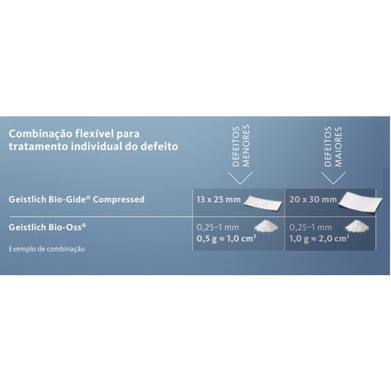 * Deve ser usada em combinação com um material para enxerto ósseo, para criação de espaço, como osso autógeno, Geistlich Bio-Oss® ou Geistlich Bio-Oss® Collagen.