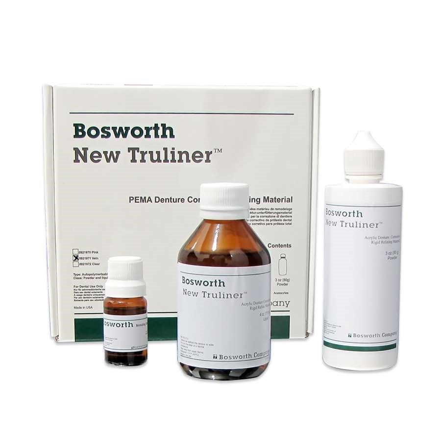 New truliner é um material de reembasamento rígido permanente desenvolvido para restaurar o ajuste original da dentadura em uma única consulta. New truliner é indicado quando ocorrer uma contração do tecido (reabsorção) fazendo com que dentaduras imediatas, reparadas e até mesmo próteses adequadamente confeccionadas tornem-se soltas e sejam necessários ajustes. Em vez de se repetir todo o processo para confecção de uma dentadura nova, é muitas vezes vantajoso fazer um simples reembase corretivo diretamente na boca.Kit com 01 frasco com 40g de pó cor de rosa com veias + 01 frasco com 50ml de líquido + 01 frasco com 10ml de adesivo + 01 dosador de pó + 01 dosador de líquido.