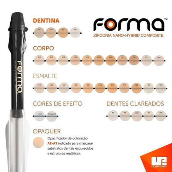 Todas as cores da Resina Forma Ultradent seguem a escala Vita® e são radiopacas.