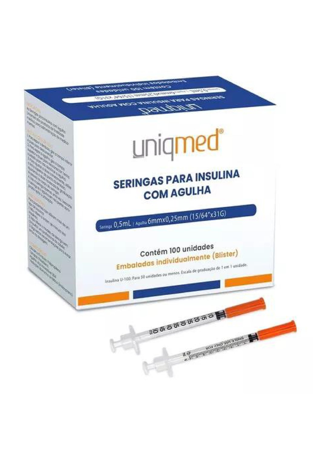 * Seringas para insulina com agulha consistem em um tubo graduado e um êmbolo móvel, conectados a agulhas.