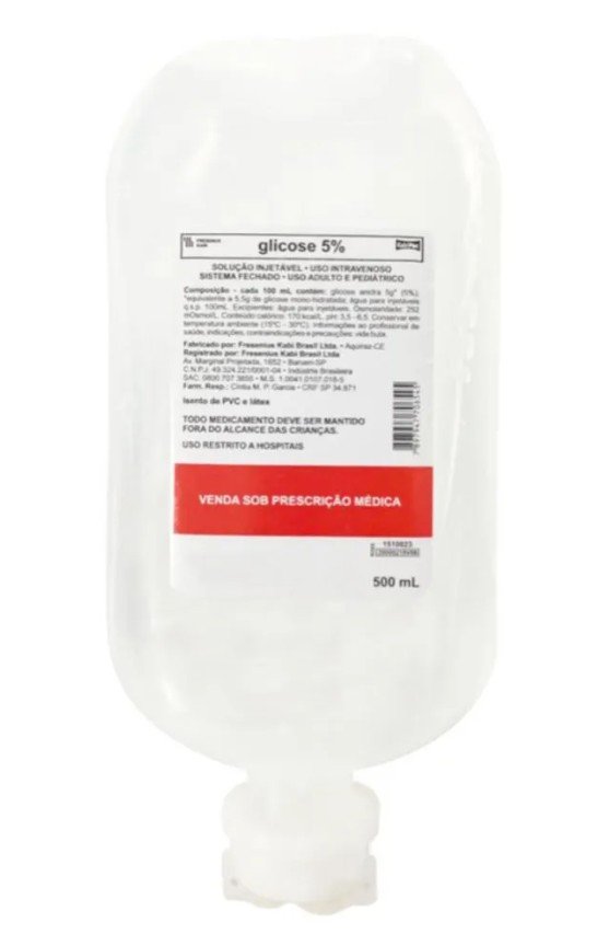 Solução estéril de glicose a 5%, acondicionada em frasco de 500 ml. Indicada para reposição de líquidos, fornecimento de calorias e diluição de medicamentos compatíveis em procedimentos parenterais. Produto destinado exclusivamente a uso profissional de saúde.